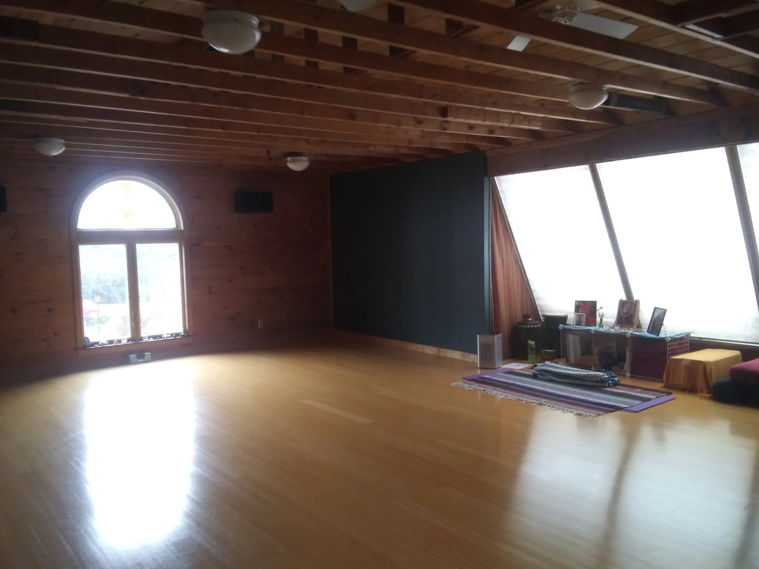 A 500 square foot space, the yoga studio has a bamboo floor, stained glass window and large skylights that fill the space with natural light.